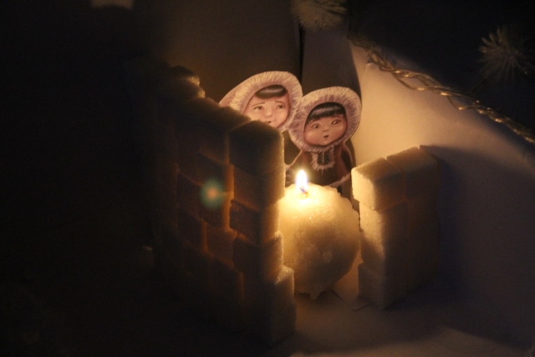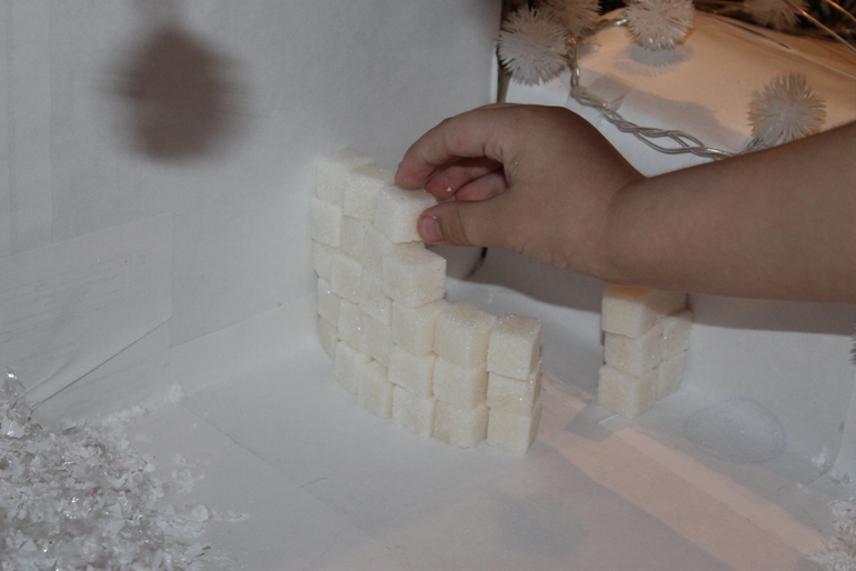 Дом эскимоса - это иглу, он из снега и льда.Помогаем ему построить дом (строим из кусочков сахара).