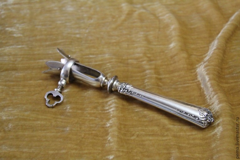 7. Кто я? А теперь выдвигаем свои гипотезы о том, что же это такое? Выслушиваем все версии. Задаем уточняющие вопросы. Зачем винтик и ключик? Почему навершие раскрывается цветочком? Зачем ручка украшена? Для чего делать инструмент из серебра? Раскрываем тайну: на самом деле это - столовый прибор. Зажим для птицы и дичи, чтобы, например, брать жареную курицу за ножку, и потом удобно было её разрезать.