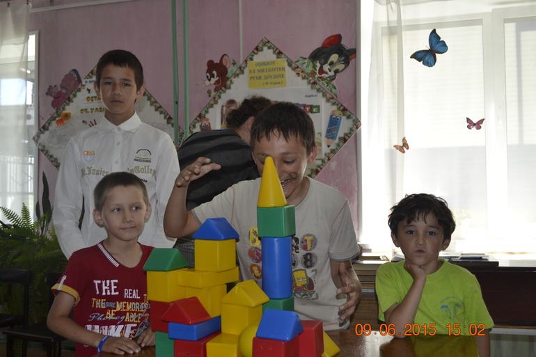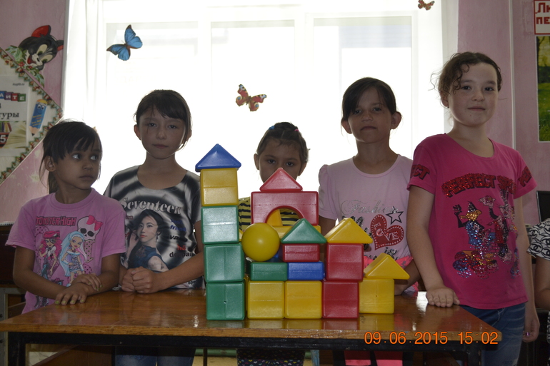 У команды девочек получился голубь несущий розу. Их объяснение: голубь - символ добра, а роза - красоты. А у мальчиков символ состоял из колосьев пшеницы под солнцем - как знака земледелия, родового знака башкирского племени Кыпсак и столба.
