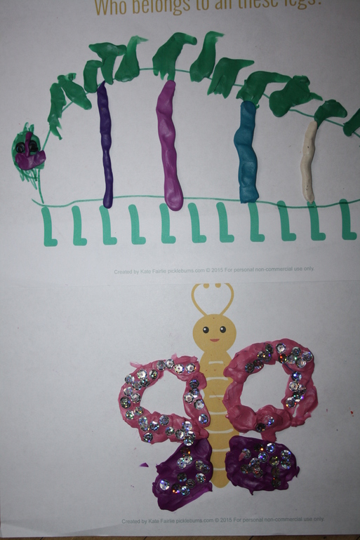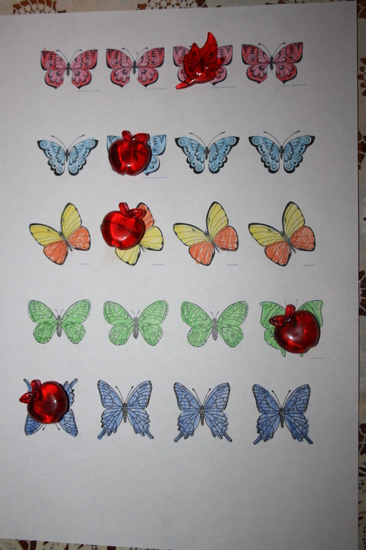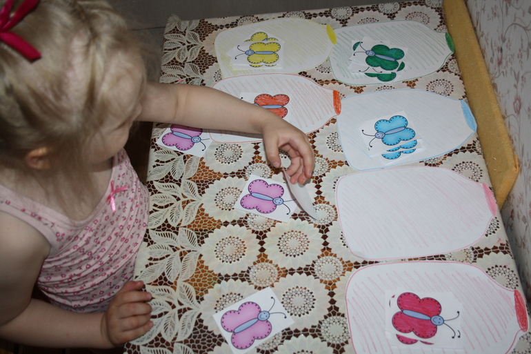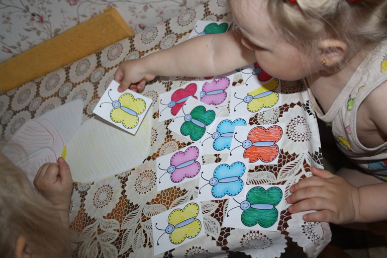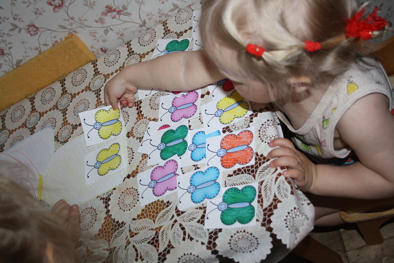 2. "Ловили" бабочек в банки в соответствии с цветом. Рассчитывала на младшую, но Катя тоже захотела "половить". Здесь я использовала материалы Александры.