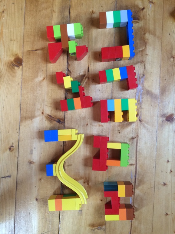 КОнструировали буквы из лего (тут больше, чем Грибочек, хотя сравнивал и помогал много, но П (неожиданно) Грибочек собрал сам)