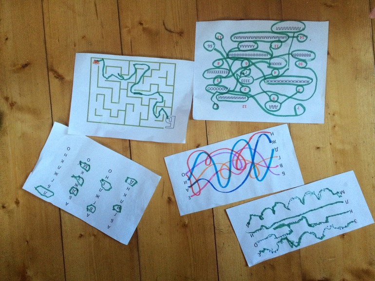 Часть на логику (делюсь если надо) - лабиринт, что лишнее проводилки, считали сколько штук какой буквы и соединяли с соответствующей цифрой (Грибочек искал, я соединяла)