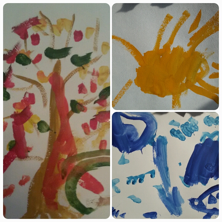 Рисовали дерево осеннее, солнце, дождик. У дерева ствол коричневым - я рисовала, листья Саша без моей помощи ( только краску подсказывала менять и мыть кисточку). На фото видно загогулю - это ветер листья кружит ( -ете- ууууу), так Саша сказала. А солнце и дождь вообще без моего участия рисовала, чем меня сильно обрадовала! ( кружочки, палочки, точки - умеем рисовать теперь самостоятельно))) Еще радует то, что пытается объяснить, что рисует!!!!)))