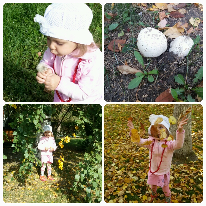 Дули на последние одуванчики, нашли поганки, играли в листопад, обнимали березки.А еще удивительно, ожили бабочки, бегали за ними, пытались поймать. Саша очень хотела дотронуться пальчиком, что почти получилось.))))