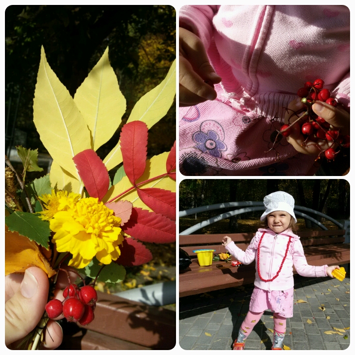 Три дня стоит тепло, гуляем целыми днями. Собирали листики в букет, делали рябиновые бусы. Прямо на улице! сначала рябину собрали в ведерко, потом Сашенька отрывала ягодки, очень аккуратно!, а я их на нитку нанизывала. Люди мимо шли и улыбались!!!!! Классные ощущения!!!)))