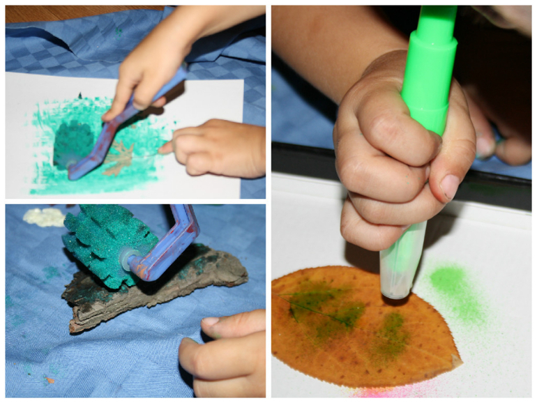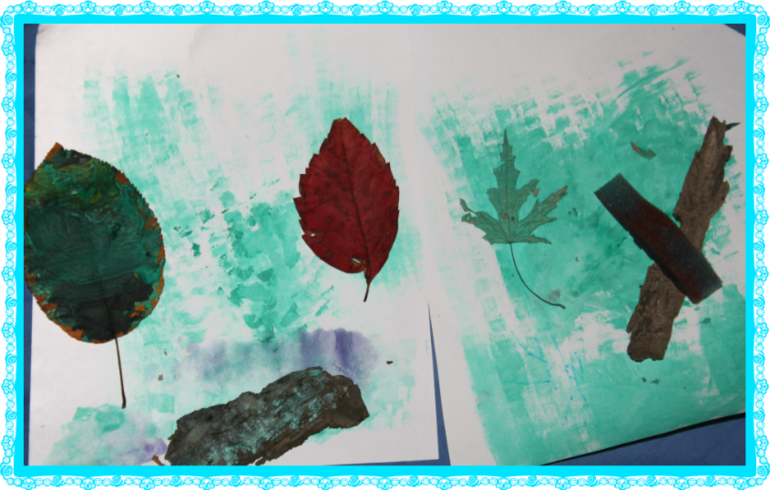 использовали сухие листья, засушенные с прошлой осени. Краски гуашь (лучше новые, они жидкие, разведенные водой старые краски плывут), кисти, валики, воздушные фломастеры