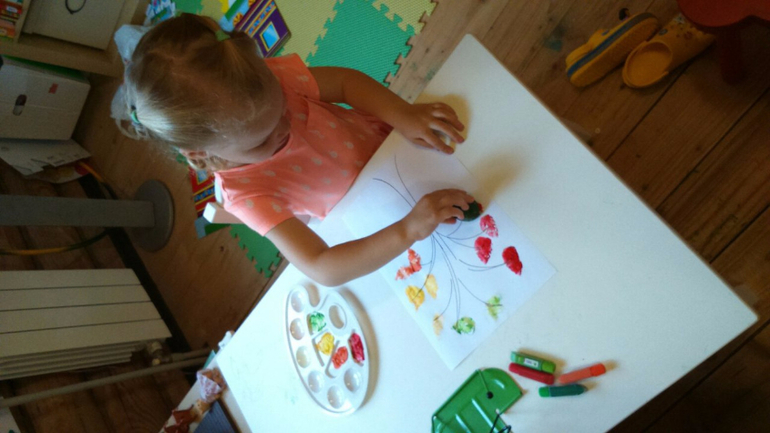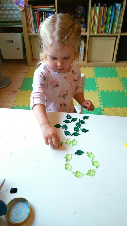 Нашли засушенные листики, которые когда-то принесли с прогулки, и немножко с ними порисовали: сделали отпечаток, а затем раскрасили. Но Аришку не впечатлило рисовать на листьях, поэтому разноцветный листок только один)