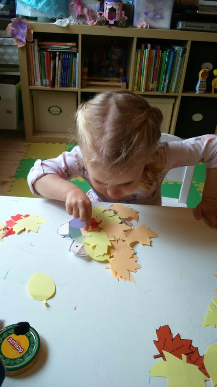 Раскрашивали пластилином листья на дереве. После этого Арина решила сделать мишку, а заодно и куст, и для завершения картины дождик, как же без него - осень!
