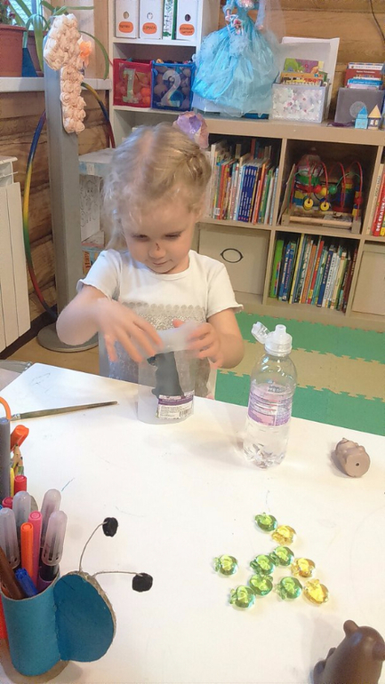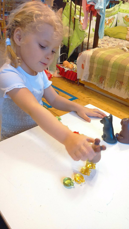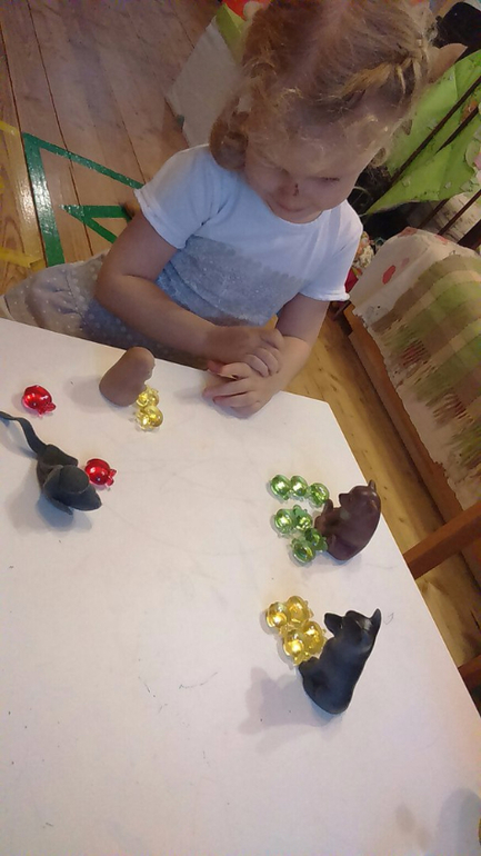 Много играли с камешками-яблочками. Раскладывали по цветам, сравнивали, каких оказалось больше, считали, Аришка придумала выкладывать фигурки, накормили всех животных яблочками, а потом Арина сама играла в ежика и волка, защищала ежика от злого волка и даже посадила его в коробочку)