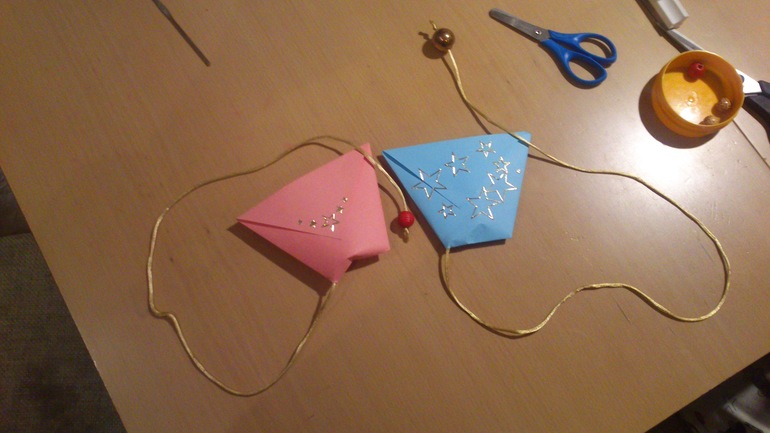 Затем через один уголок стаканчика протянуть шнурок и привязать бусину.