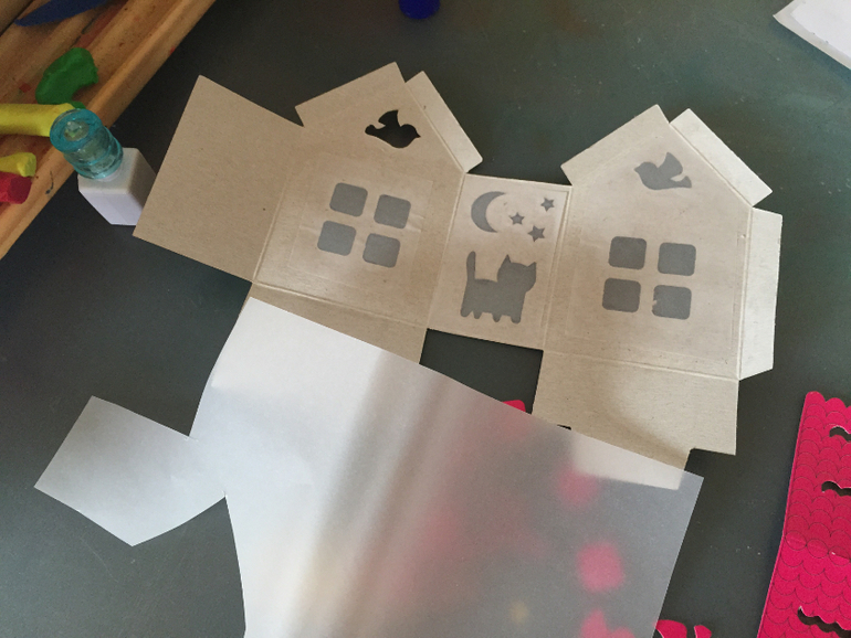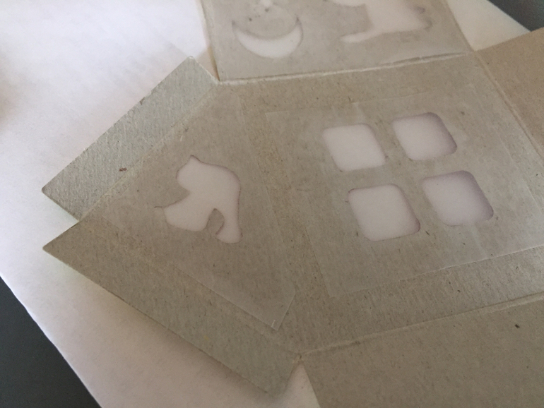 Вот такая заготовка внутри коробки, из которой надо было выдавить окошки и заклеить их изнутри калькой (прилагается).