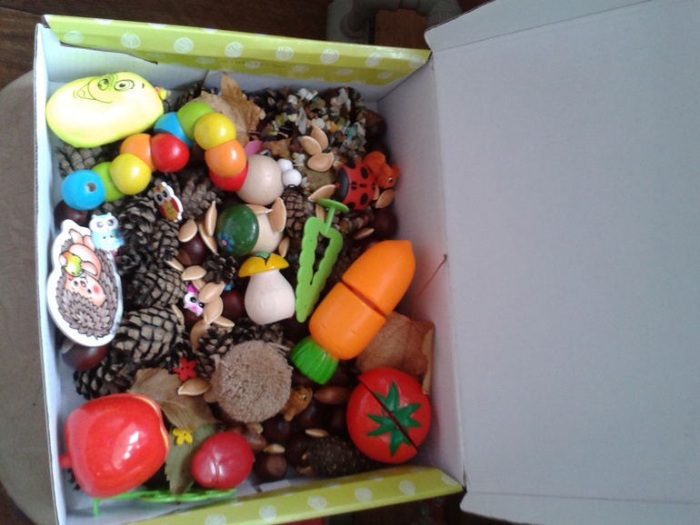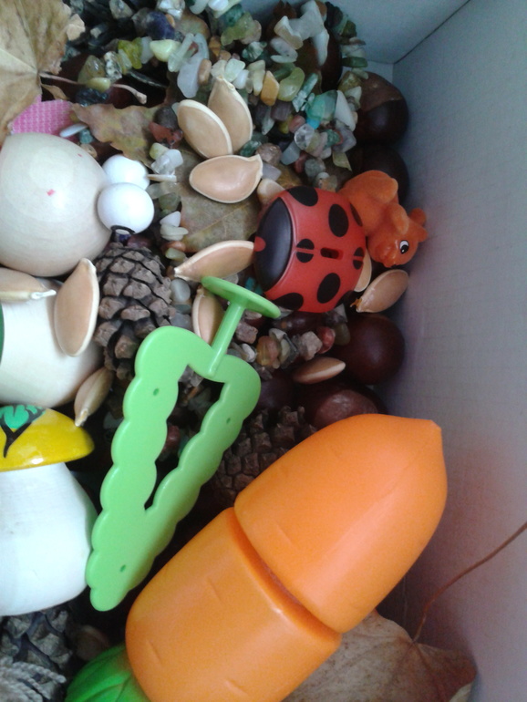 И вот еще наша осенняя коробочка: перебираем, пытаемся сортировать, кормим зайку морковкой и т. д. Спасибо здесь девочкам на ББ за идею!!!