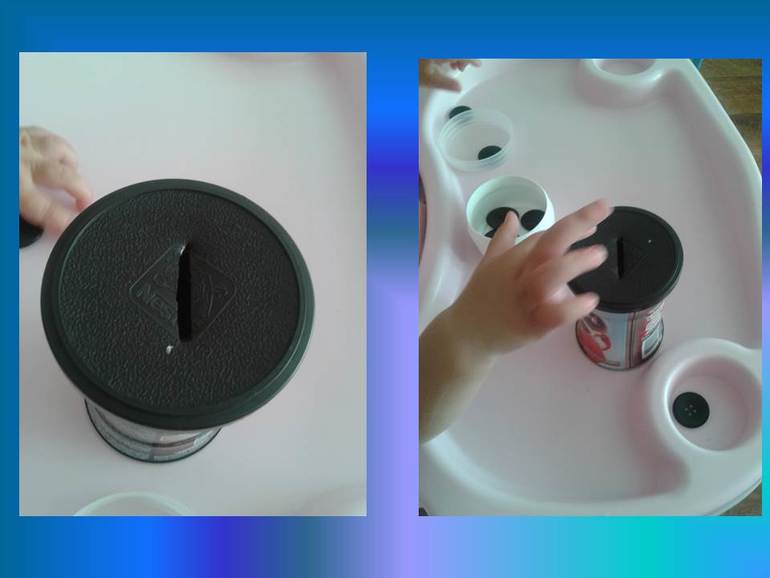 Играем, пока не совсем получается, но мы учимся))))) еще нам нравится и без крышки складывать в банку пуговицы - они замечательно звенят))))