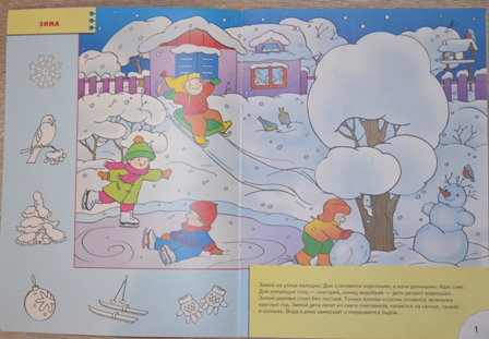 В книге «Времена года» из серии «Это может ваш малыш» даны 7 занятий, которые выстроены по следующему плану: сначала ребенок рассматривает рисунок, слушает интересную историю, и только потом приступает к выполнению определенного задания.