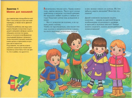 Эта книга познакомила моего ребенка с интересной техникой аппликации - разрывание цветной бумаги на кусочки и приклеивание их к картинке основе. Сначала дочке было трудновато разрывать бумагу из данной книги, плотновата она оказалась для наших ручек, поэтому мы использовали обычную тонкую цветную бумагу. Таким образом, мы сделали шапки ребятам, чтобы они не замерзли сырой осенней порой; поменяли цвет листвы наосенних деревьях; делали снежки и строили снежные крепости зимой; помогли прорасти первой весенней травке и листочкам на деревьях; приделывали барашкам, пасущимся налетнем лугу шерстяные кудряшки,…