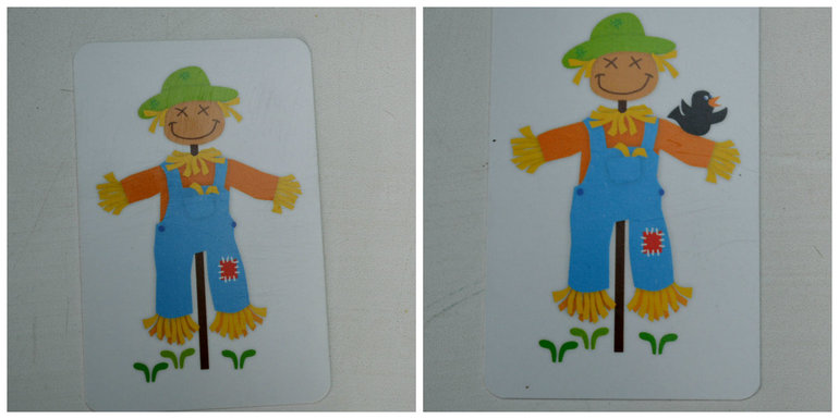 вот к примеру пугало, переворачиваем карту и видим что на обратной стороне карточки ,на плече у него сидит птичка