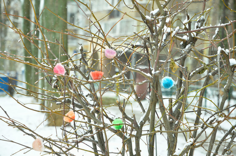 В каждую ячейку положили петельку из нитки и на ночь в холодильник, заодно посмотрели как вода в лёд превращается ( в морозилку чуть ли не каждые полчаса заглядывали), а на следующий день украшали кустик, ёлочки жалко нет по близости.