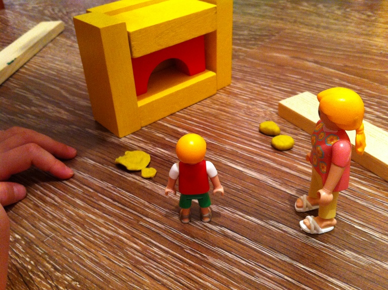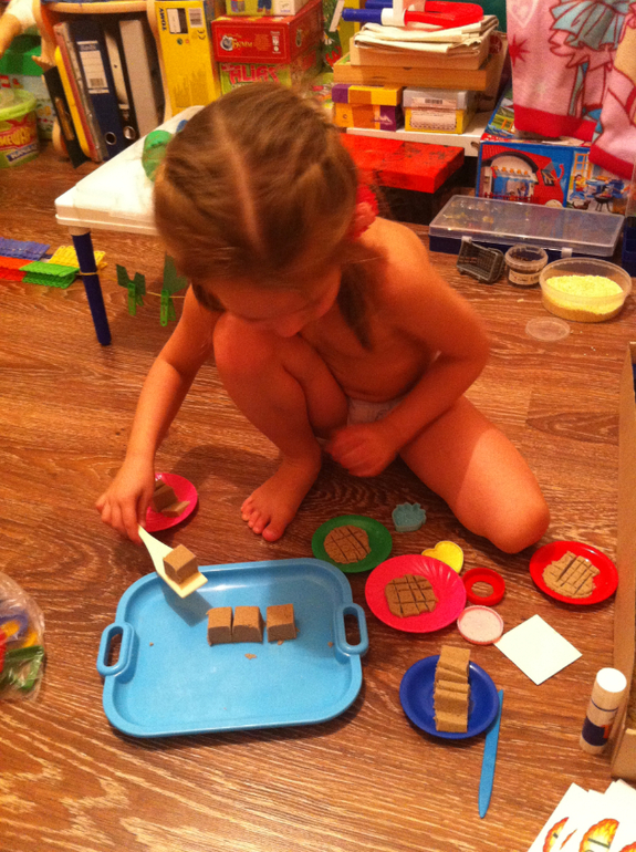 Побежала по дороге Машенька и встретила печку. Строим печку. Софья построила сама без моей помощи. Выполняем задание печки: печем пластилиновые пирожки.
