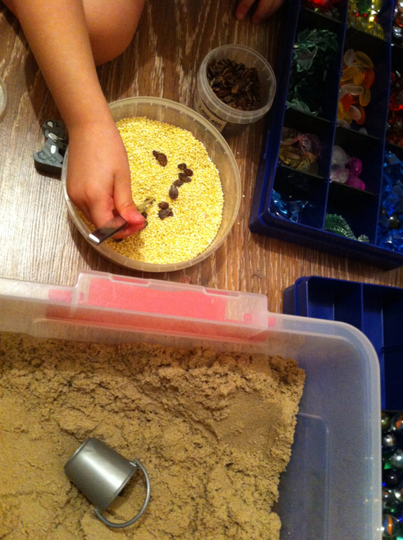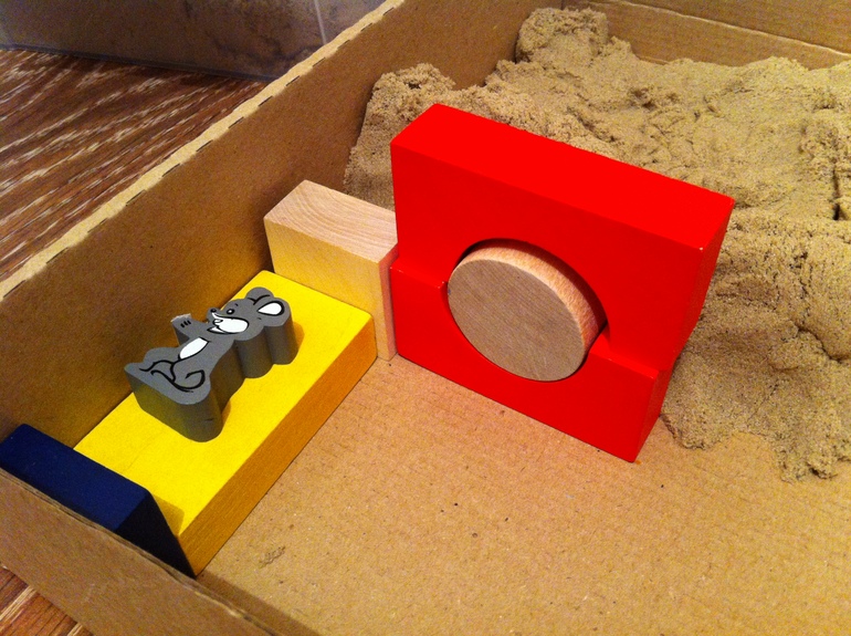 Норку построили, нужно запасаться продуктами на зиму. На кукурузном поле мышонок кукурузы набрал (ищем в пшене кукурузу), по дороге мышонок встретилось поле с подсолнухами, где мышонок набрал много семечек (собираем пинцетом арбузные семечки), а еще забрел мышонок на поле гороховое где набрал много-много гороха