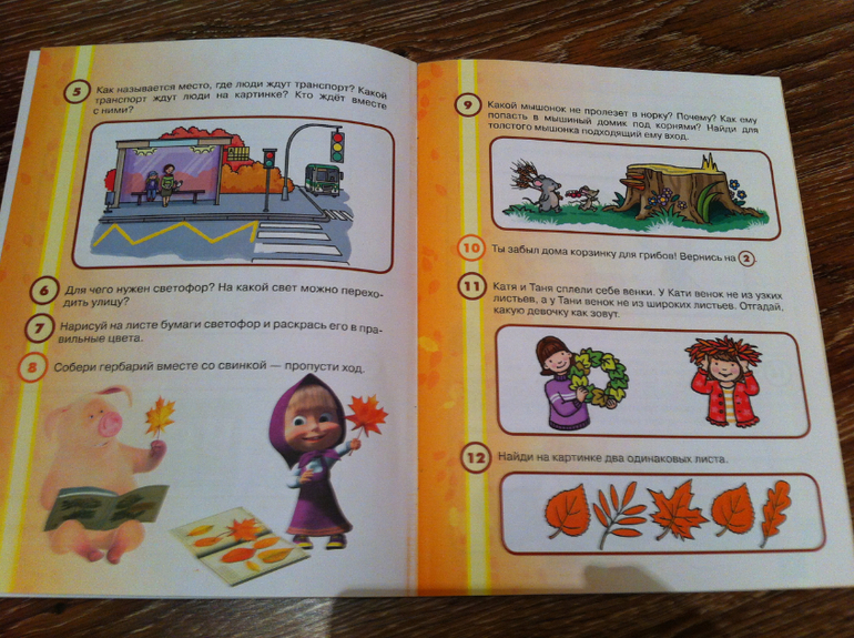 Еще играли в развивающую игру ходилку по мотивам мульта Маша и медведь. Смысл: встаешь на клетку и выполняешь задание. Интересная задумка и задания классные. Покупала в фикс прайсе 4 книги, все они по сезонам, мы конечно взяли осеннюю. Вместо фишек у нас конечно герои мультика - фигурки маши и медведя, цель добраться через лес до домика медведя.