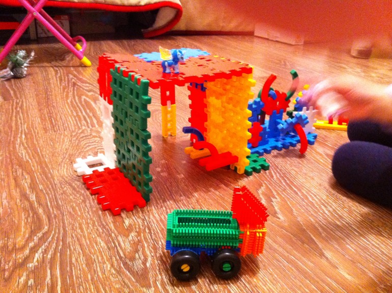 Строили транспорт, мойку из конструктора и долго с ними возились….справа Сонина машина)