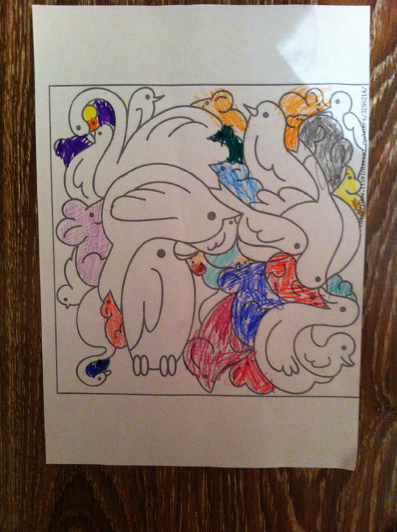 Спаслись детки от гусей и направились в дом, а тут и родители подоспели и подарок для Машеньки принесли - платочек. Задание раскрасить по образцу на память - сначала показываем разноцветную мандалу, ребенок в течение нескольких секунд запоминает, переворачиваем картинку, ребенок на память раскрашивает другую картинку. У нас вышла ошибочка.