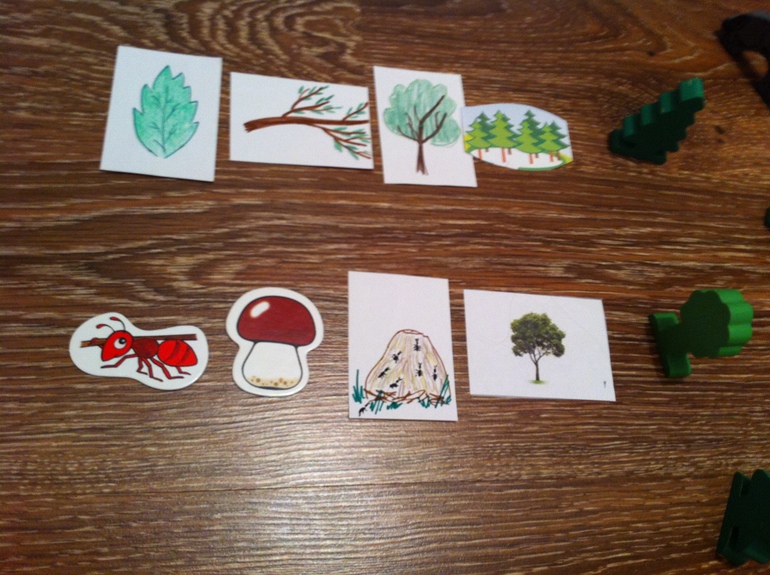 Ну и дальше собственно сама сказка. ...Унесли братца гуси-лебеди, в роли которых выступали бумажные самодельные самолетики, фото нет. Пошла Машенька братца выручать, дорога вела через лес... Поставили лес из готовых материалов. На этом этапе поговорили о лесе, его признаках, кто населяет лес. Разложили картинки от меньшего к большему, выстраиваем иерархию в системе, также определили, что обе системы являются подсистемами, которые объединяются системой ЛЕС.