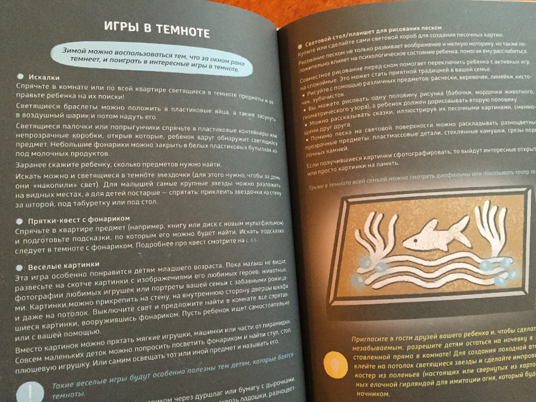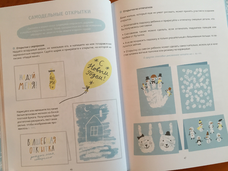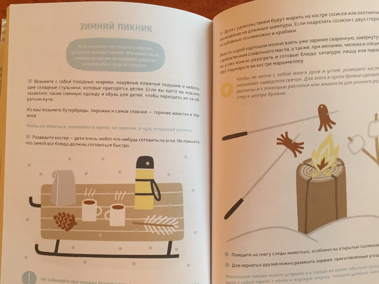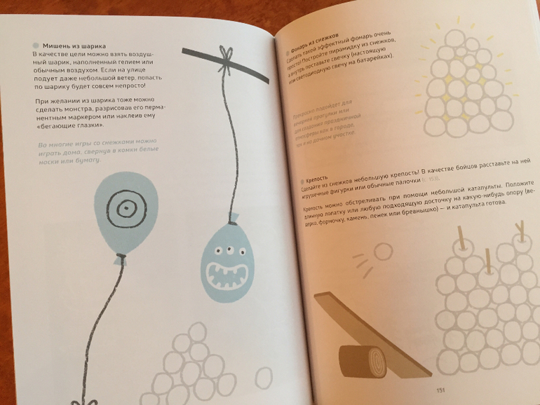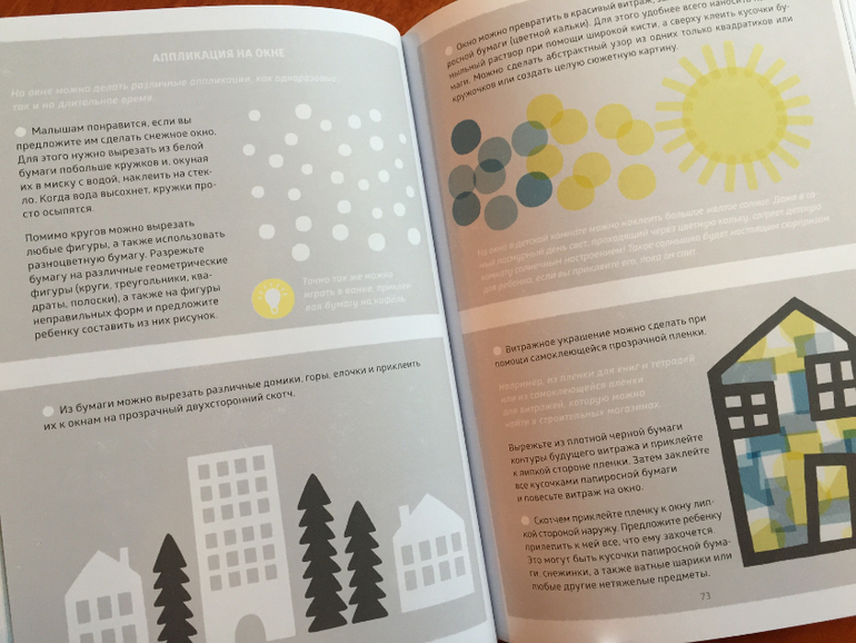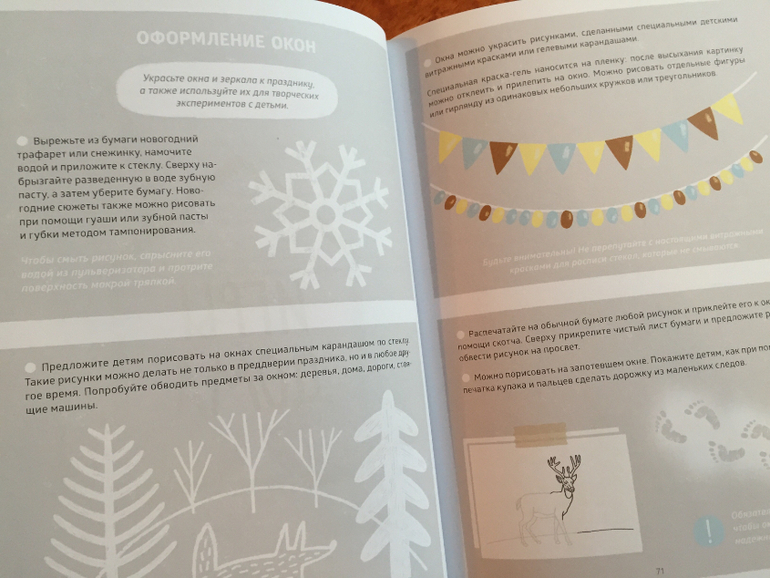 На более чем двухстах страниц книги собрана масса интересных идей по времяпровождению с детьми зимой (и не только зимой, как оказалось!): украшение квартиры и совместные поделки к Новому году, игры на улице - подвижные и со снегом, список необычных подарков и их оформление, создание адвент-календарей, игры дома - картонное строительство, домашний театр, рисование на стекле и бумаге в разных техниках, создание волшебных банок и светильников...