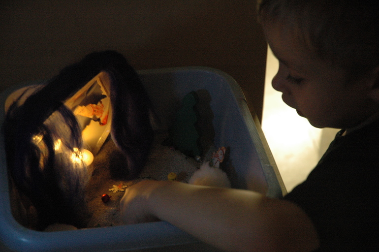 Дальше песочница. Матвей очень любит сенсорные коробки и тематические песочницы. Недавно мы были на спектакле про Гнома и теперь у нас все игры про гномов...)) у нас есть фонарик, теперь есть домик гномика, думаю скоро и сам гномик придет...)))) подарки принесет..))