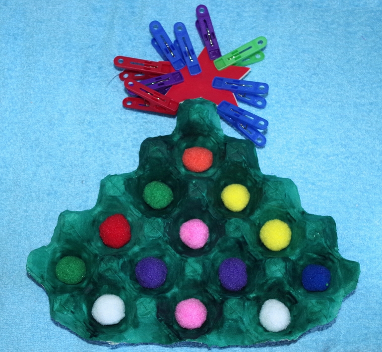 Вооружаем ребенка щипцами и наряжаем ёлочку. В углубления также можно разложить/приклеить цветные кружочки и попросить малыша разложить шарики (или крышечки) на соответствующие цвета.