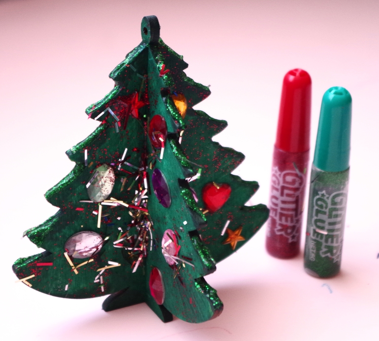 4. Из материалов: деревянная заготовка "Ёлочка", декоративные камешки на липкой основе, клей с блестками, кусочки мишуры, краска акриловая зеленая.