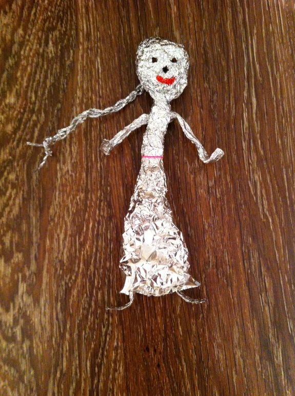 Мастерили из фольги. Доченька долго с фольгой просто играла, шуршала. Мяли, катали шарики, скручивали сосульки, делал колечки, смастерили вот такую куклу, делала ее я сама, а вот косу плела дочка.