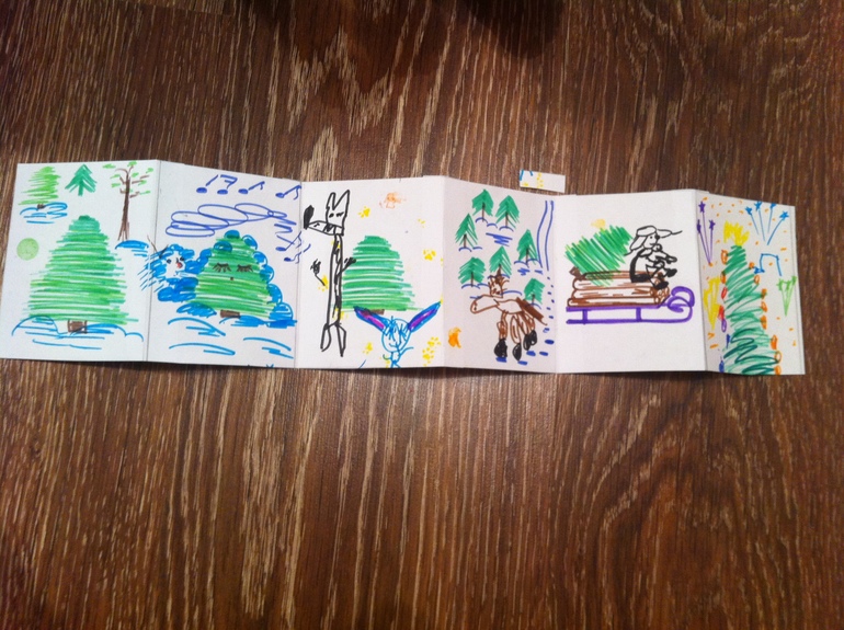 Дальше мамина фантазия разыгралась. Поскольку Соня никак не могла запомнить очередность куплетов в песне, то я предложила ей нарисовать каждый куплет. Отличная получилась у нас брошюрка… Первая и вторая картинки чисто мамины, на третьей и четвертой волк, заяц и лошадь - это Сонины шедевры, Сани с мужичком - мое, и последняя нарядная елочка тоже Сонина. Причем она нарисовала елку нарядную, я попросила ее изобразить радость, т.к. в песне про радость поется - Соня нарисовала нотки. Ок, в ее представлении это и есть радость. Ну а я нарисовала радость в виде салюта, дочка со мной согласилась.