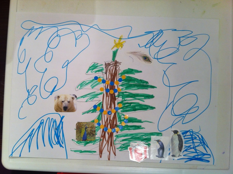 После очередного пропения доча решила нарисовать елочку. А я уже предложила ей оживить картинку, т.к. одна елочка как то пусто смотрится. Предложила технику коллаж, т.к. наклеек много и их нужно использовать по назначению. Вот что получилось… очевидно, что каляки сверху - это вьюга, снизу горы снега.