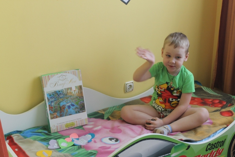 Последнее сердечко в руках у Артёма и он быстро бежит к своей кроватке. А там его уже ждёт подарок.
