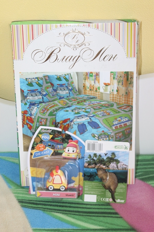 Мы подарили Артёму постельное бельё с любимыми героями из мультфильма, машинку Мини из этого же мультфильма (собрана практически вся коллекция) и бобра (Артём очень любит животных. Их у нас очень много, потихоньку мы пополняем коллекцию))