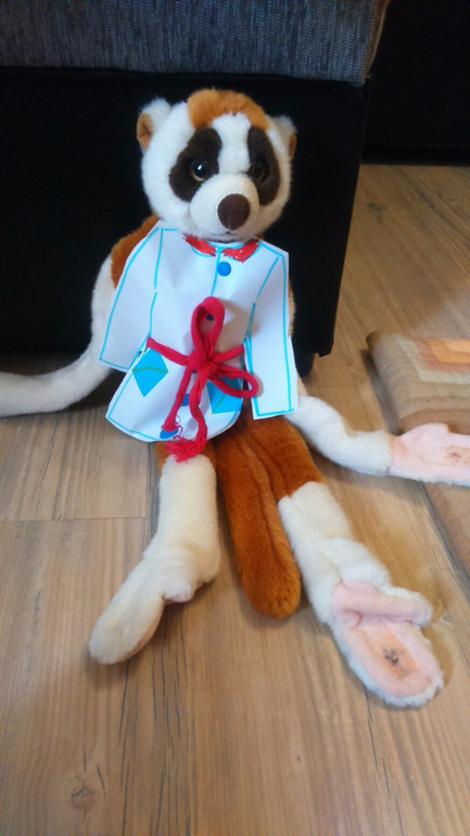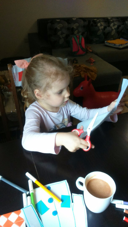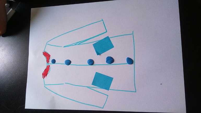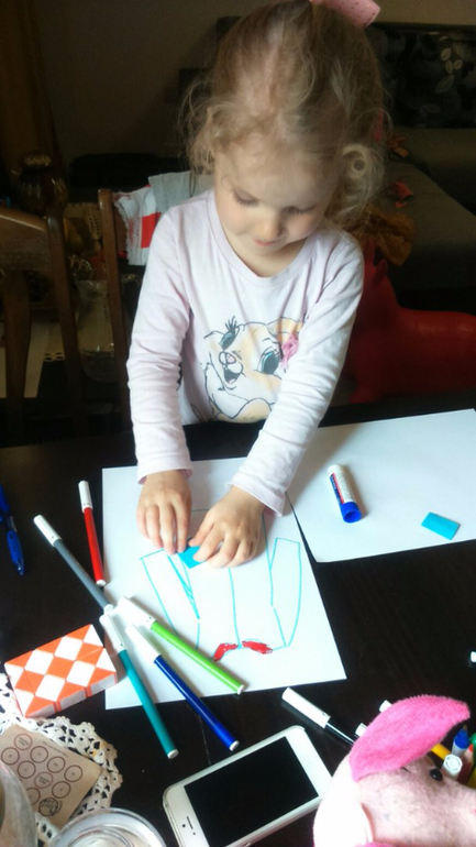Далее Арина вошла во вкус и захотела сделать еще поделку. Я нарисовала силуэт пальто, Арина наклеила карманы, затем из пластилина приклеила пуговицы. И решила вырезать это пальто))