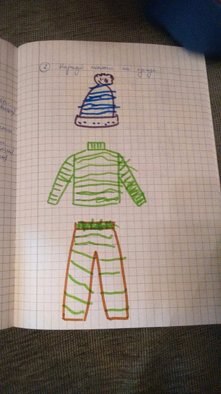 Затем нарисовали полоски на одежде, сначала по пунктиру, а потом самостоятельно.