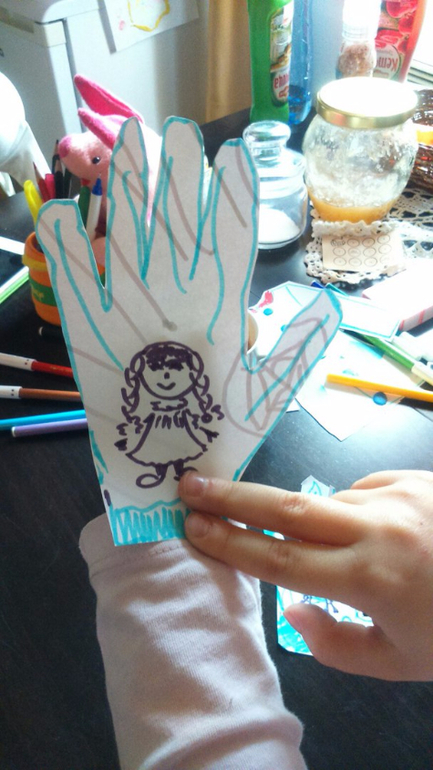 Нарисовали перчатки. Обводили ладошки и раскрасили (украшали). И опять-таки вырезали.