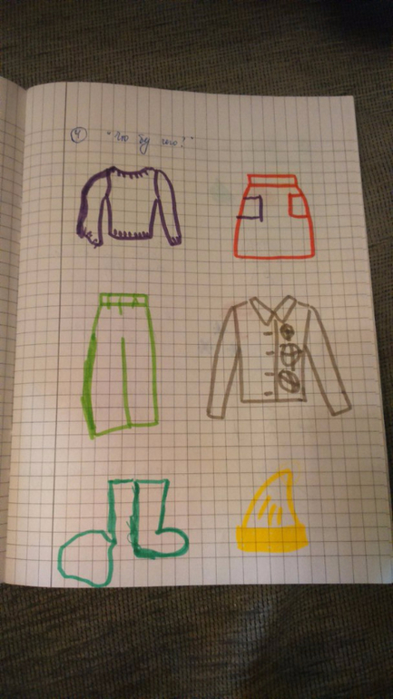 Сделали новое задание - составить рассказ. Для этого нарисовала опорные картинки и пояснения. Связный рассказ, конечно, не получился, Арина просто отвечала на мои вопросы, но зато рассказала много: и про свою куртку, и мою, и папину, и свои штаны, и про платки)))