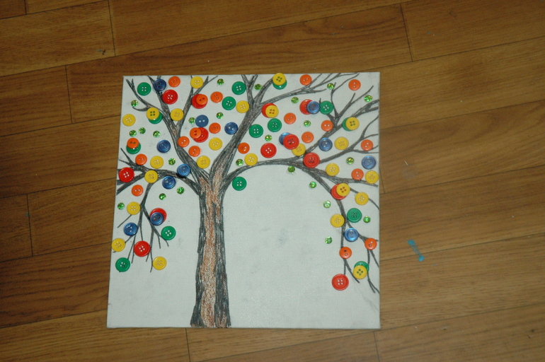 В этот раз мы делали дерево на холсте и украшали его пуговками и зелеными пайетками.