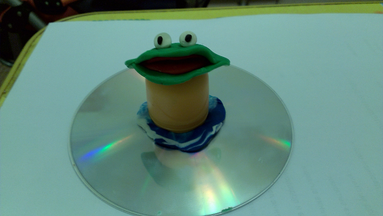 3,На серединку лепешки, ставим половинку капсулы от Киндер сюрприза.-Это будет туловище лягушки.