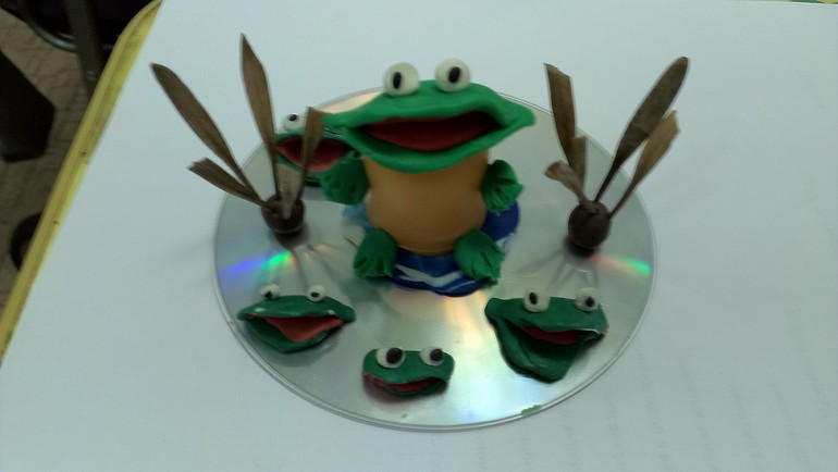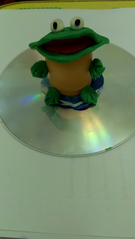 Крепим их к туловищу....И вот, получилась смешная лягушенция....Возможно она где то корявенькая, но думаю это все простительно, тк делает ребенок...