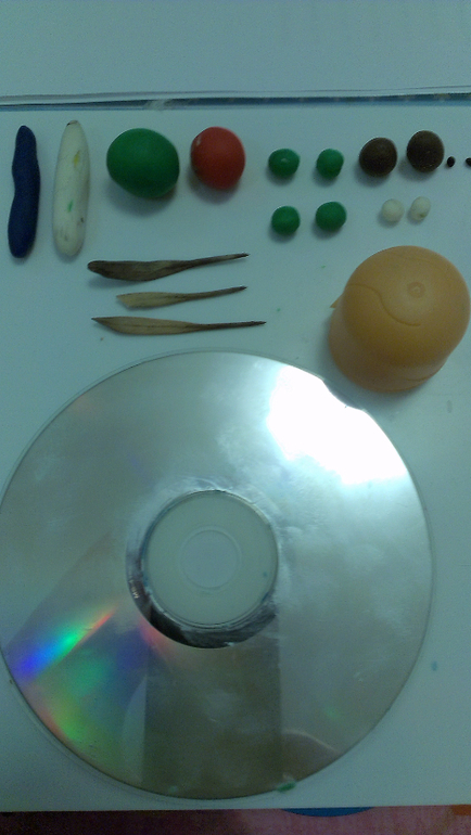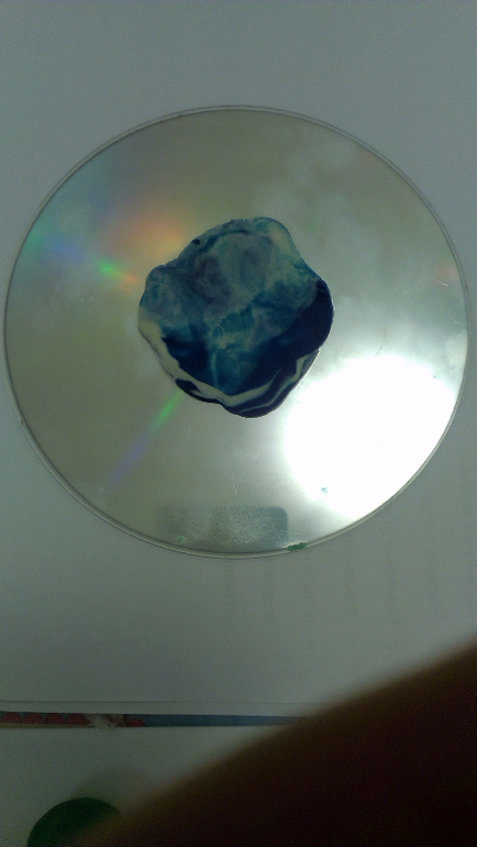 2,Две колбаски синего и белого цвета, смешиваем ,катаем шарик, а из шарика делаем лепешку,и крепим ее на середину диска.