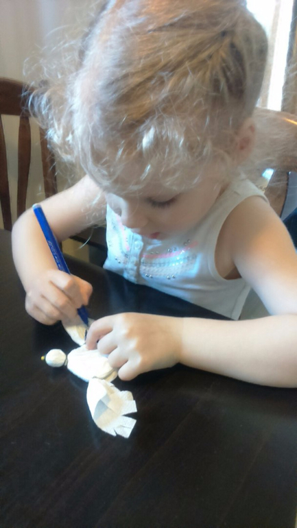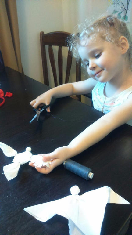 Делали птичек из салфеток, я скручивала нитками, Аришка надрезала перья на крылышках и раскрашивала.