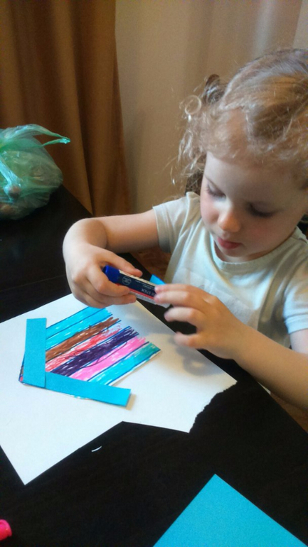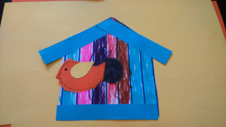 Вспомнили, что в России птички живут в скворечниках и получилась такая аппликация. Домик нарисовали, раскрасили, приклеили крышу, окно, скворца и цветочки, которые Арина сначала сама рисовала, но почему-то свои ей не понравились, попросила меня нарисовать.