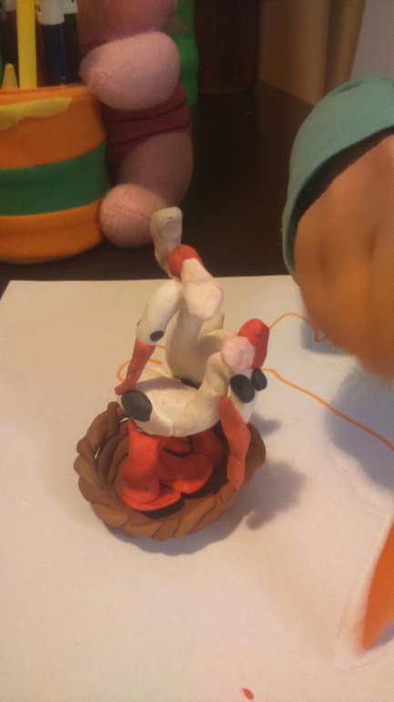 Слепили аистов - маму и дочку, как Арина сказала. Затем гнездо)