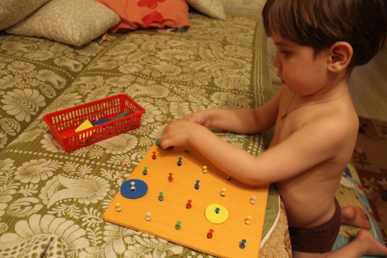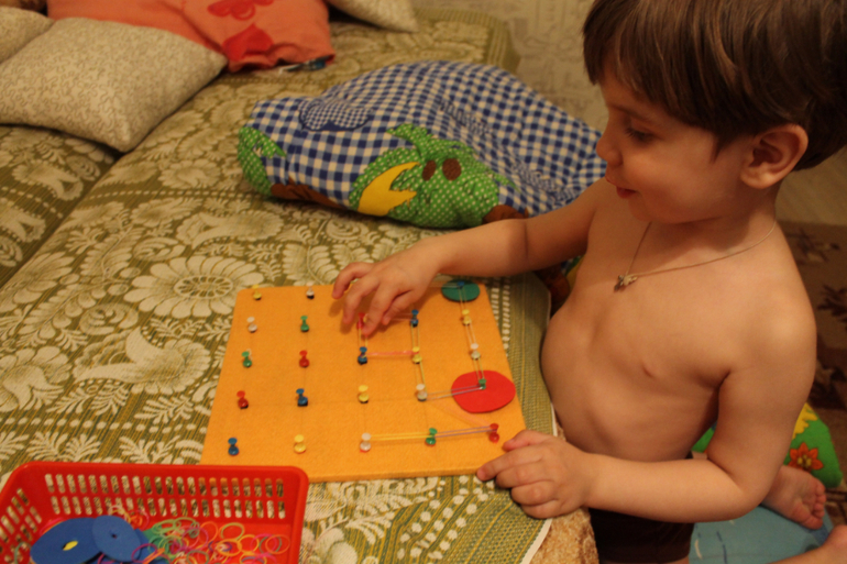Поелику в стране, городе и нашей квартире финансовая ж финансовый кризис, математический планшет делала своими ручонками. И немножко папиными (в смысле, моего папы). Собственно мужская работа заключалась в том, чтобы вырезать квадрат из толстенькой фанерки (ДВП? ДСП? ПСП? СПС? ДМБ? Я вообще привыкла говорить «дощечка», но муж поднимает меня на смех и тем самым мстит за мои филологические претензии к нему). Это было самой трудной частью. Дальше - легче: обтянула квадратик тканью (мой любимый рабочий материал - вискозная тряпка для пола. Цвета красивые. Края, главное, обрабатывать не надо). Можно было покрасить, но с тканью уютнее. Приколотила кнопки-гвоздики (тут была одна засада: фанерка всё-таки оказалась недостаточно толстой, и чтобы кнопки не вылезали наружу, использовала малюсенькие подкладочки из пористой резины (пенки?) и заколачивала не до конца - однако, руками не вырвать. Зубами не пробовала, но… Митя всё-таки не до такой степени грызун. Техническая информация: стандартная длина острия у таких кнопок - 12 мм). Кнопок 25, из них погнутыми/кривыми, со сломанными шляпками вышло штук пять. Резиночки на волне увлечения плетением фенечек сейчас купить нетрудно. Собственно всё. Ах, да: интервал между штырьками классический: 5х5. Вот она моя красавица.