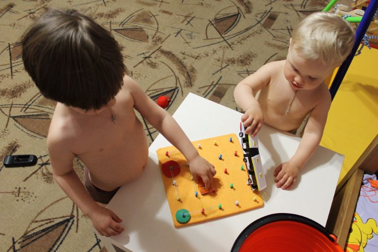И тут пришёл Митя. Водрузил автобус: оказалось, он занимает как раз одну дорожку. Ну что ж, играем в парковку. Притащили маленькие машинки, трактор, вертолёты. Возили по дорожкам, парковали (Митя - бессистемно, Серёга иногда получал задания: приземлиться в сине-жёлто-белый квадрат, например, а потом отыскать такие же…) Объезжали друг друга, можно было ещё направления движения закрепить, но не стала перегружать.