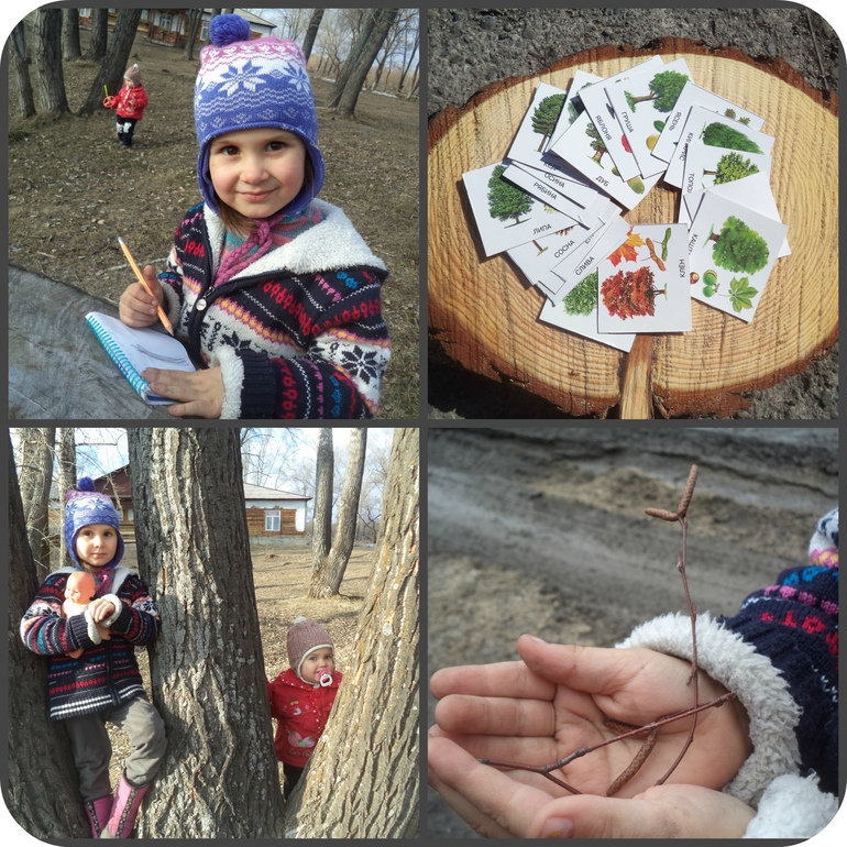 Ранней весной, когда только набухают почки, дочка не с могла определить названия ни одного дерева, кроме березы. В голову пришла мысль - запечатлеть весь цикл развития кроны деревьев, также хотела уделить внимание и разной коре деревьев. И так, я объявила начало охоты на деревья, взяли фотоаппарат и вперед! Прогулка была продолжительной, вот что мы нашли: черемуха, ярга, клен, ель, сосна, тополь, береза, лиственница, рябина.